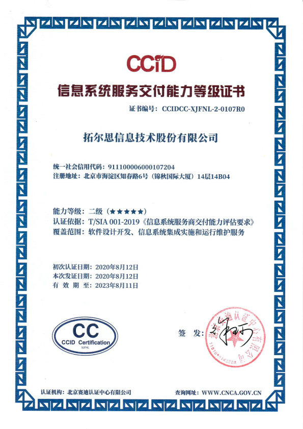 资质 | 拓尔思获得信息系统服务交付能力二级(5星)等级证书
