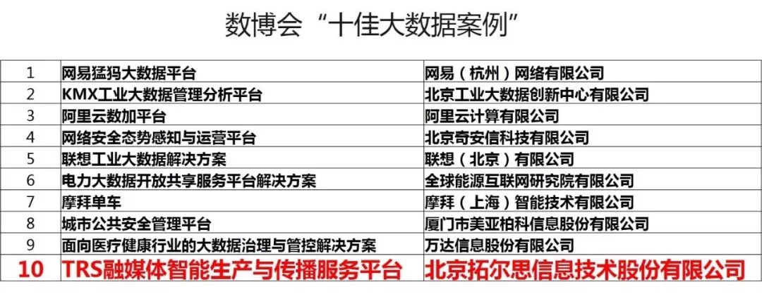 5月26日,上周六,本是全国人民休息的日子,贵阳,举行了一场盛事——2018中国国际大数据产业博览会开幕了。当天下午,工信部、国家发改委、国家网信办在贵阳联合举办《大数据优秀产品和应用解决方案案例系列丛书》发布会暨数博会“十佳大数据案例“揭晓活动。拓尔思从1000余家参选企业中脱颖而出,一举拿下两个奖项。拓尔思旗下子公司科韵大数据的水晶球分析师平台入选《大数据优秀产品案例》,拓尔思的TRS融媒体智能生产与传播服务平台更是入选全国“十佳大数据案例”。
