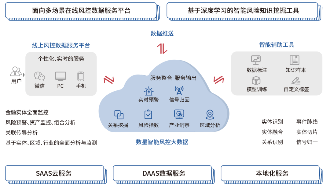 TRS数星既是面向多场景的在线风控数据服务平台,也是基于深度学习的智能风险知识挖掘工具,为金融机构提供基于“SAAS+DAAS+本地化”的综合在线服务平台,通过智能多维标签、预警信号推送、风险事件跟踪、风险传导关联、综合异构图谱等贯穿多场景全流程的风险管理功能,实现对市场主体的风险监控。TRS数星监测数据全面覆盖包括宏观政策、新闻舆情、研究报告、公告数据等在内的多源异构数据。