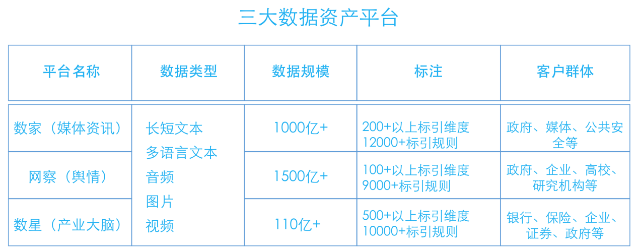 公司2010年就自建了大数据中心,以长期服务多行业用户持续积累的开源数据为基础,拥有了规模及质量均位列业界前茅的公开信源数据,目前数据总量超1500亿,并仍保持日均亿级数据的采集增长。公司一直坚持探索“1+1=N”数据业务模式,持续研发了丰富的数据服务产品,目前已经形成了以服务政府、金融、媒体、新兴企业为主的行业SaaS产品集群。