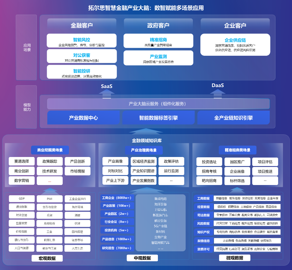 拓尔思建设智慧金融产业大脑,构建对公营销与智能风控业务模型,融合宏观经济、中观产业、微观企业多维度数据,通过投融资、产业分析与客户数据分析,打造数字化营销获客平台与智能风险监控平台。