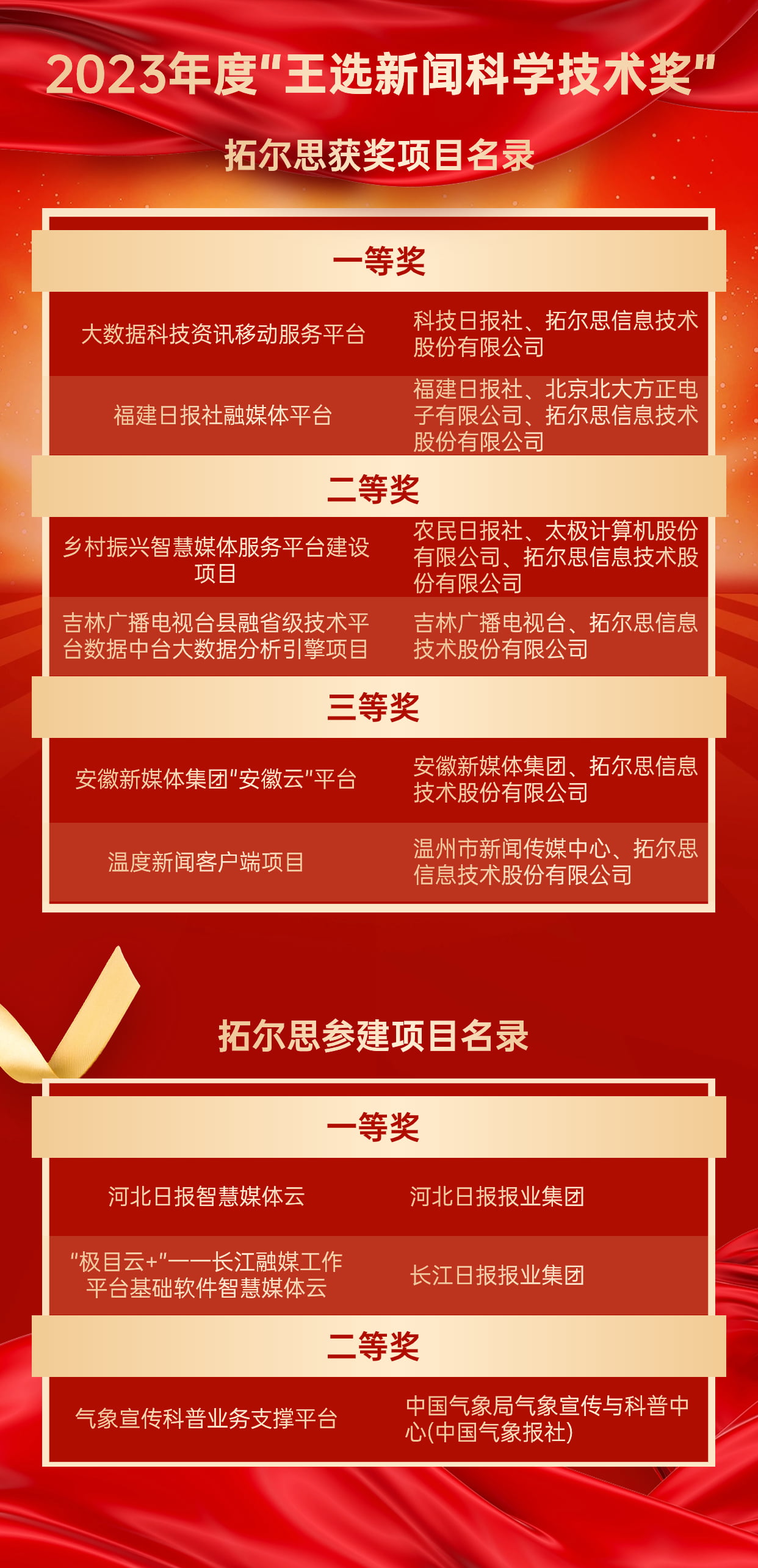 10月9日,中国新闻技术工作者联合会正式公布2023年“王选新闻科学技术奖”项目奖获奖结果,拓尔思信息技术股份有限公司承建的多个项目成功入选,获得一等奖2项、二等奖2项、三等奖2项。
