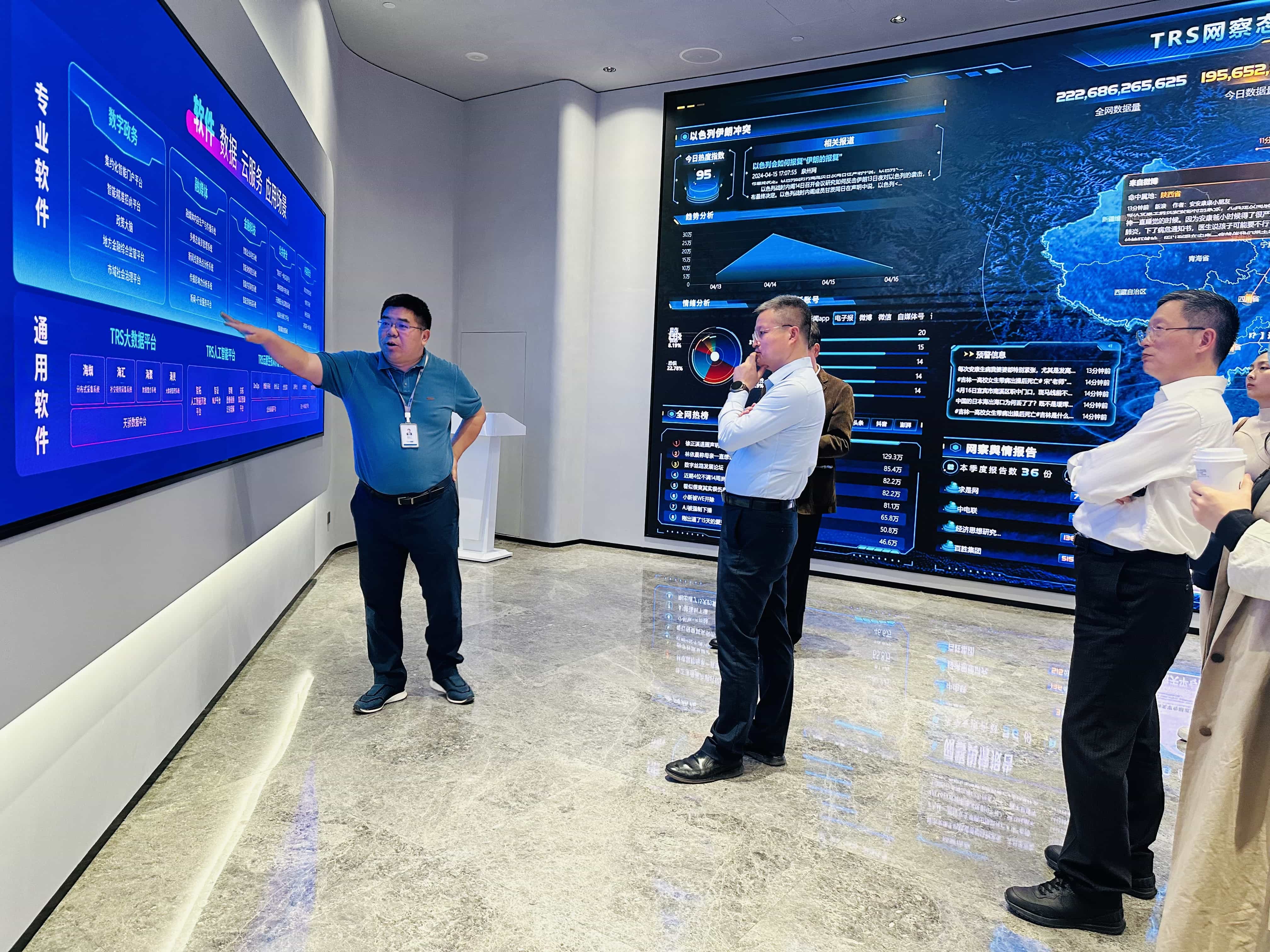 拓尔思信息技术股份有限公司总裁兼董事长施水才携开源情报事业部相关人员陪同调研组参观了拓尔思产品展示中心,施总介绍了拓尔思发展历程、核心技术及行业应用,展示了公司在网络舆情监测领域的核心产品——网察态势感知系统及自主研发的拓天大模型。
