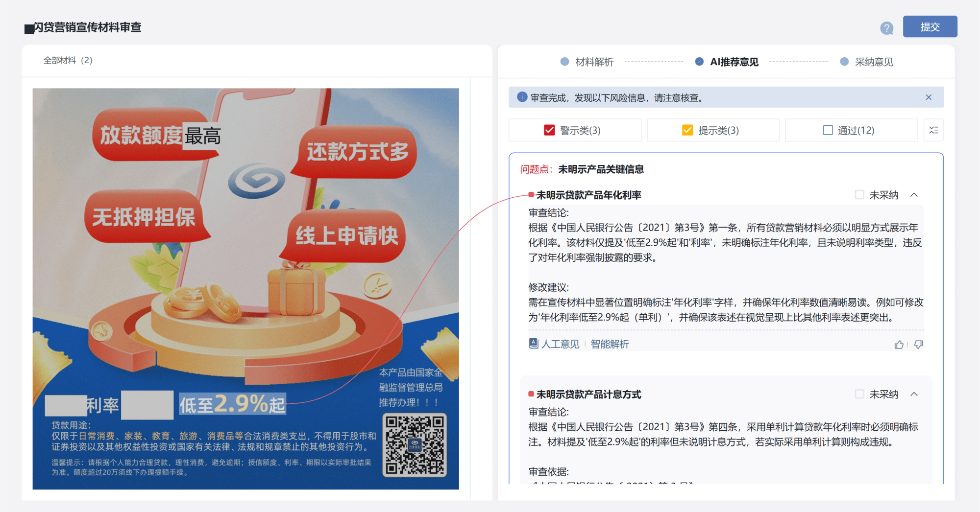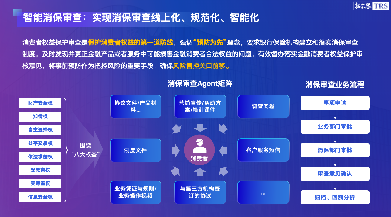 拓尔思依托自主研发的消保知识库与领域大模型,精准识别误导销售、不公平条款、信息披露不充分等核心风险,通过统一审查标准、规范审核流程,最大限度减少违规行为。方案深度融合AI Agent的自主感知、决策与执行能力,实现产品宣传材料从线下人工审核向线上化、自动化、智能化审查的跨越式升级,将风险识别关口大幅前移。